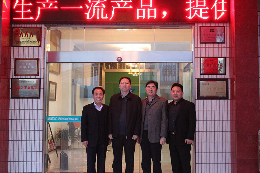 圖三 中國軸承協會秘書長周宇(左二)、中共白甸鎮黨委副書記 . 鎮長劉建軍(右二)、科星化工董事長吳龍鐵(左一)、科星化工總經理傅士超(右一)