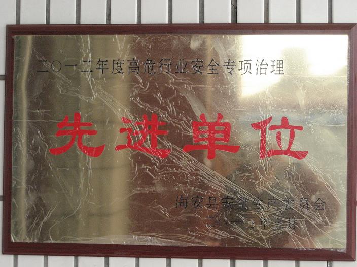 我公司被海安縣安全生產委員會評為《二0一二年度高危行業安全專項治理先進單位》。