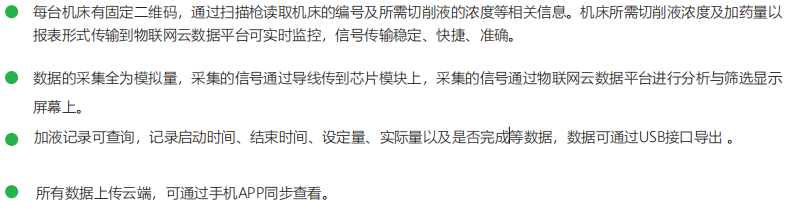 本系統(tǒng)通過(guò)掃碼槍讀取機(jī)床標(biāo)號(hào)及所需要切削液數(shù)量等信息,系統(tǒng)定量給機(jī)床添加工作液并記錄時(shí)間,數(shù)量等數(shù)據(jù),同時(shí)保存數(shù)據(jù)并上傳,本系統(tǒng)可移動(dòng)、性能可靠、顯示直觀、操作簡(jiǎn)單。