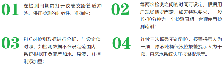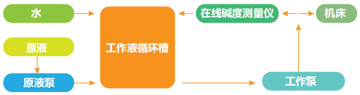 游離堿是切削液中的儲備堿,是切削液使用過程中有效濃度的重要指標,在線堿度自動滴定測量儀,安裝在集中供液管線上,周期性對工作液堿度進行檢測,PLC系統可以根據檢測結果對濃度進行適度跟蹤、調整,使得工作液始終在目標范圍內。