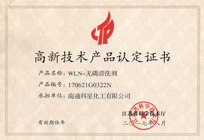高新技術產品認定證書-WL-無磷清洗劑