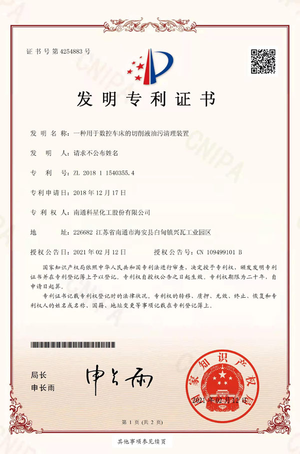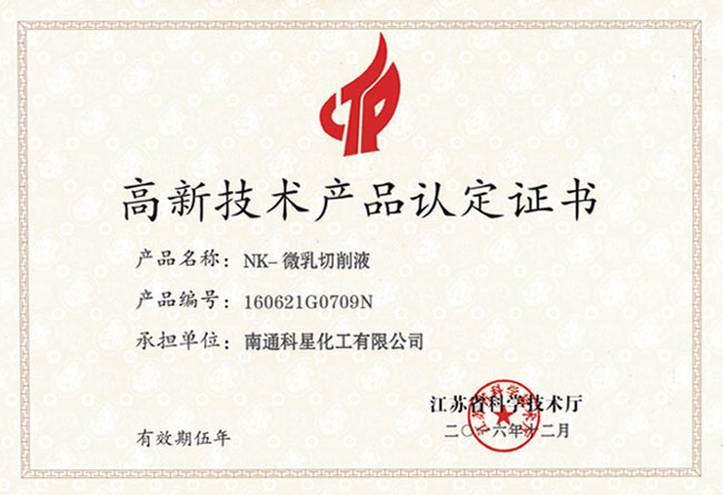 高新技術產品認定證書-NK-微乳切削液