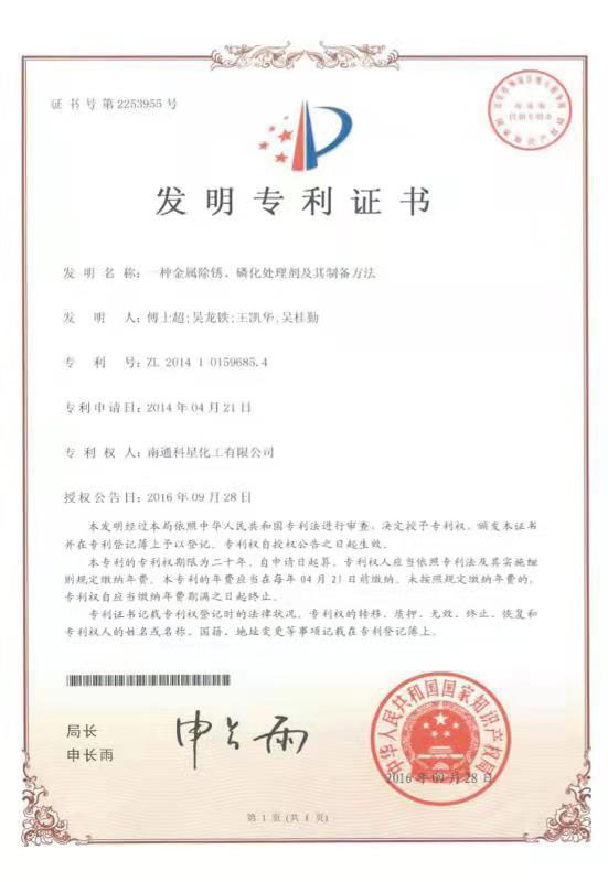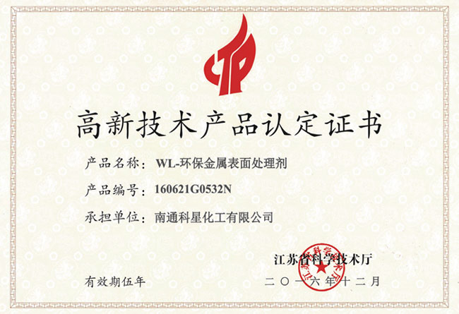 高新技術產品認定證書-WL-環保金屬表面處理劑