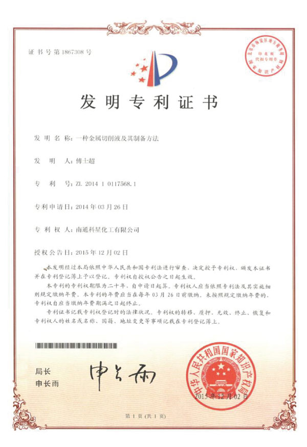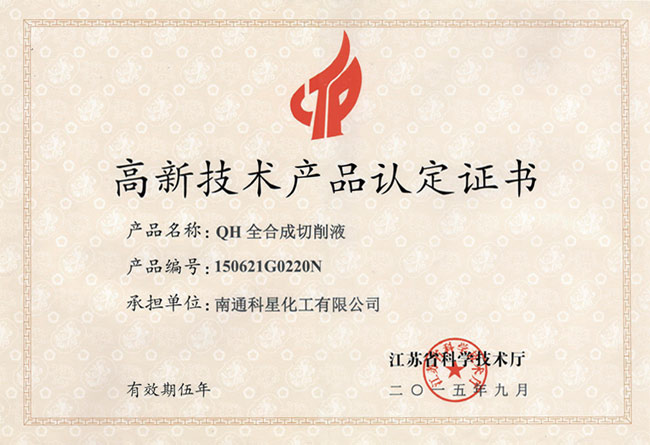 高新技術產品認定證書-QH全合成切削液